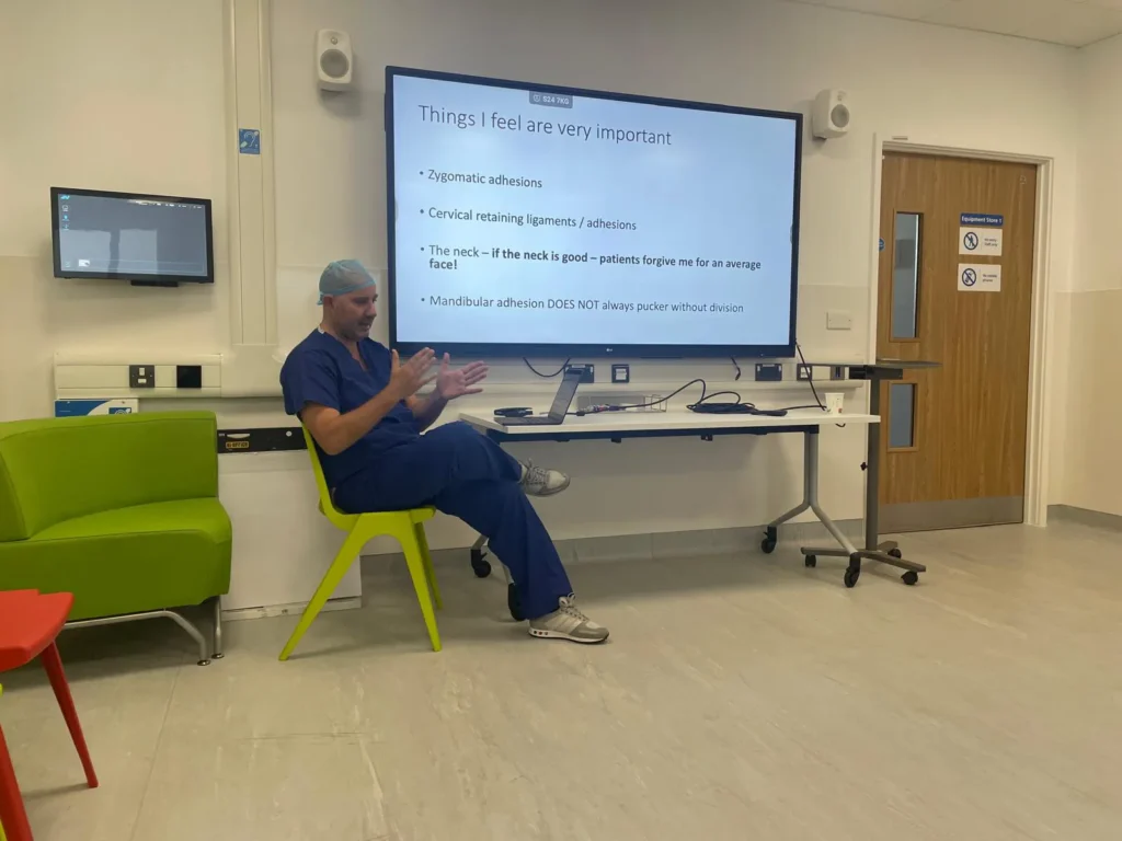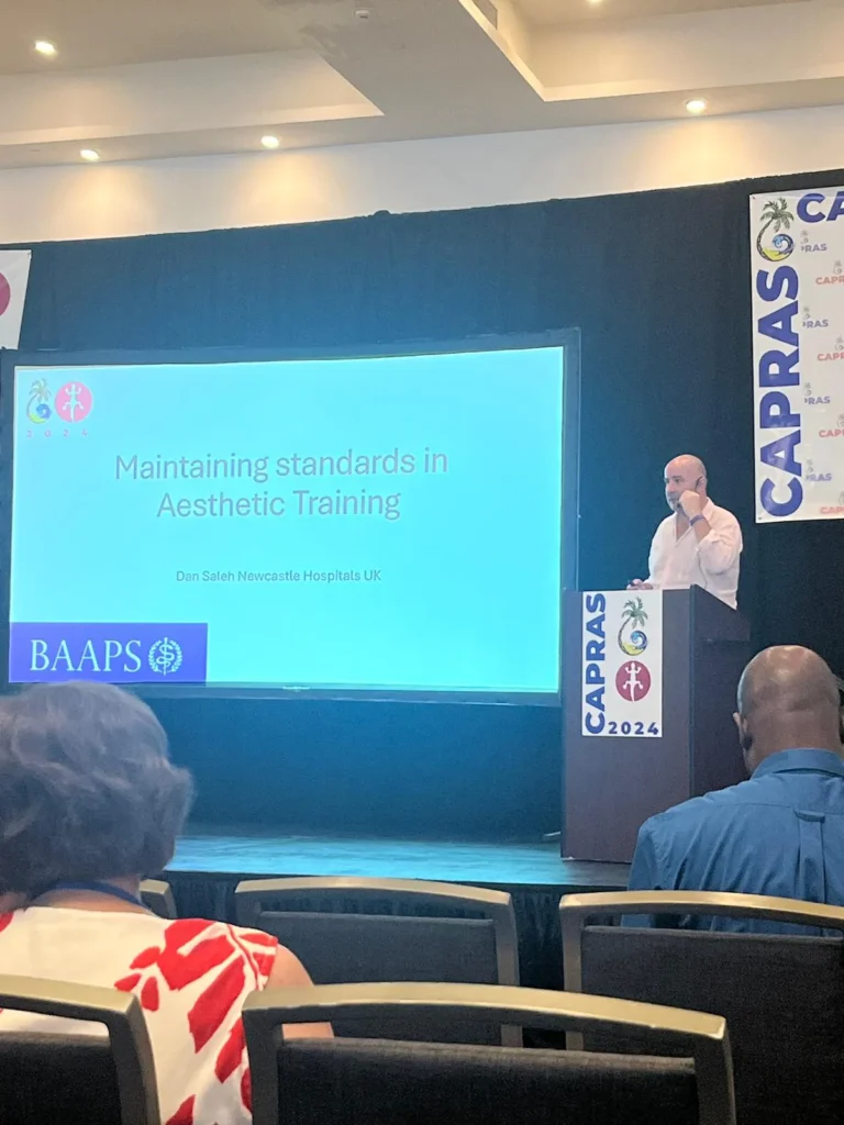 Dan is a dedicated trainer (and learner!). Since 2023 he established and co-runs ‘The Face Course’ (https://www.thefacecourse.co.uk) with colleague Bill Townley teaching international delegates in advanced face and eyelid aesthetic surgery. As a council member for the British Association of Aesthetic Surgeons (the BAAPs) he has a major role in delivering regional teaching days to plastic surgeons in training and co-ordinating delivery of the cosmetic surgery curriculum to ensure the highest safety and ethical standards for those becoming consultant surgeons. Dan runs a BAAPs and BAPRAS Nationally awarded aesthetic fellowship (https://baaps.org.uk/trainees/aesthetic_fellowship.aspx) and surgeons from around the world come to the North East on the European Academy of Facial Plastic Surgery fellowship (https://eafps.org/eafps-fellowship-program/).